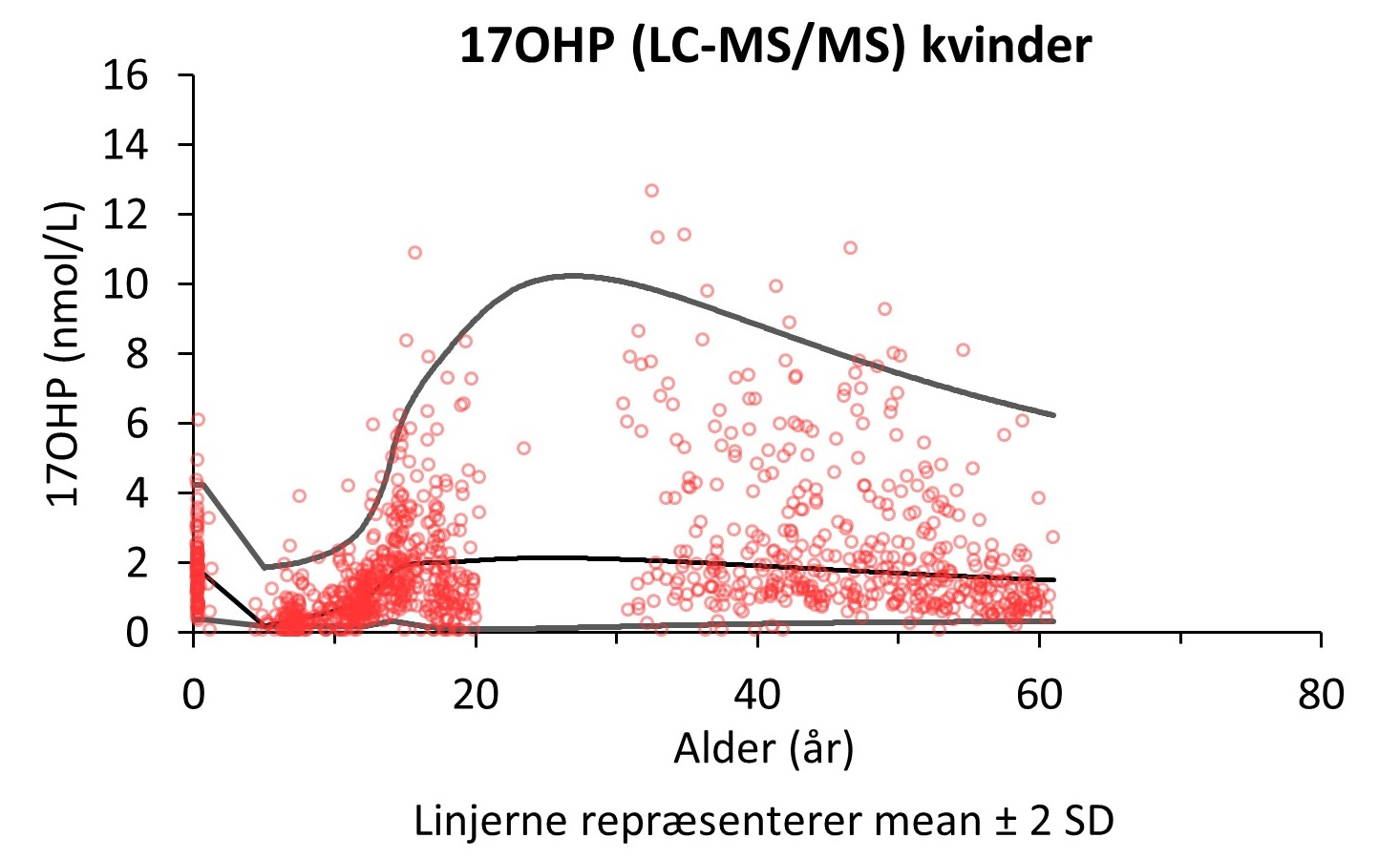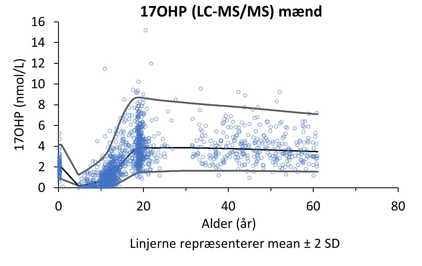 | Referenceinterval: | Der er indkørt et normalmateriale baseret på forskellige populationer (Den københavnske mor-barn-kohorte, Den københavnske pubertetsundersøgelse, Undersøgelsen over sædkvalitet hos unge danske mænd og Glostrup Helbred 2008-undersøgelsen). Normalmaterialet indbefatter 1056 raske piger og kvinder og 1462 raske drenge og mænd i alderen 0-61 år. Referenceområdet er inddelt i alder og køn. |